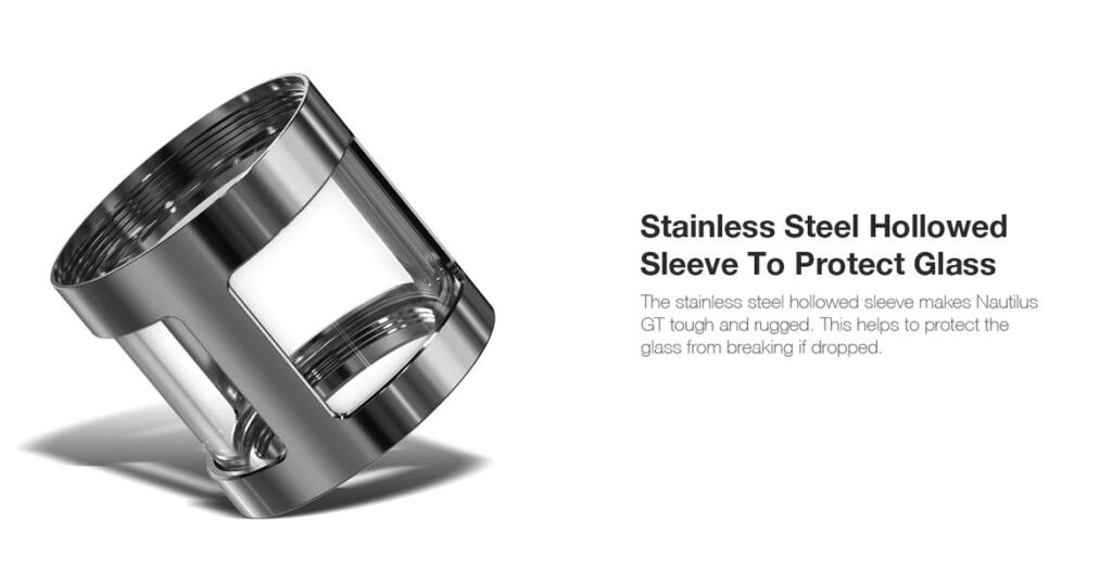 The GT is constructed from stainless steel which offers protection against drops and accidental damage, while the drip tip and chimney are designed to minimise heat retention and protect against condensation in the chimney.