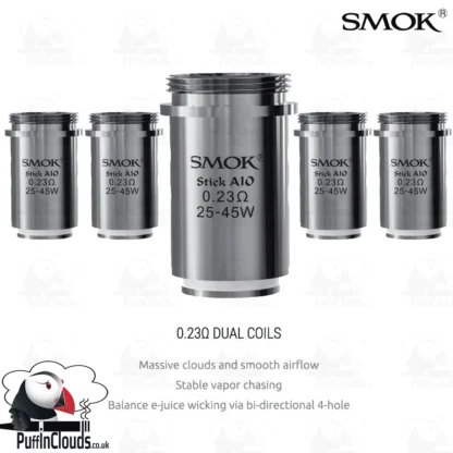 SMOK Stick AIO Coils (5 Pack) – replacement coils for the SMOK Stick AIO vaping device. These amazing coils come in a choice of resistance: 0.23 Ohms which are rated at 25 to 45 Watts and designed for the SMOK Stick AIO and 0.6 Ohms which are rated 25 to 45 Watts and are designed for the SMOK Priv One Kit. The AIO Coils are made from stainless steel and feature dual core heads. Great flavour and cloud production.